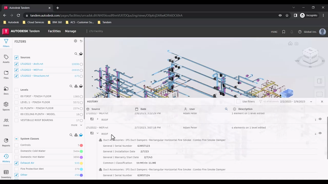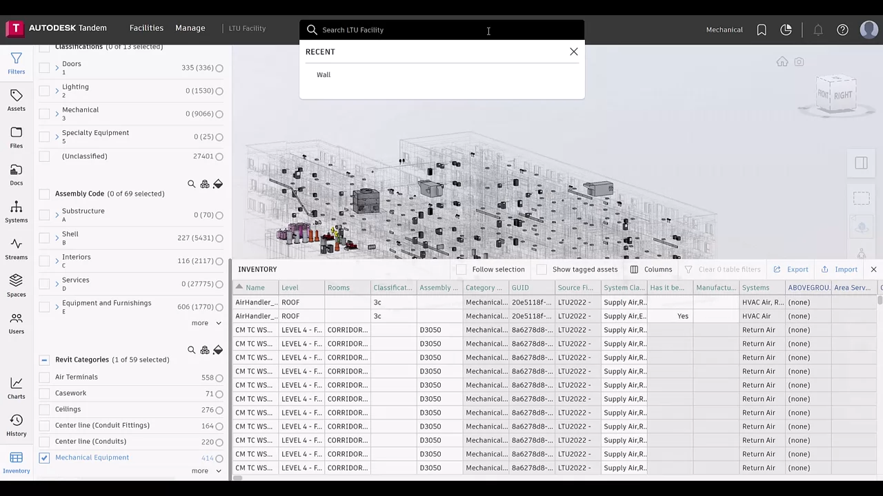 Revise e gerencie todos os dados associados aos espaços de uma construção com a ajuda de uma lista dedicada de ambientes e níveis. Visualize por nível, mostre todos os recursos associados ou veja as tendências em dados de fluxo para tomar decisões operacionais bem informadas.