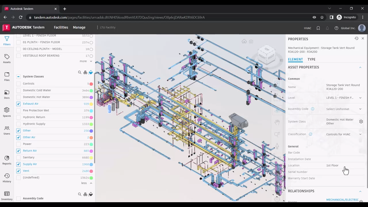 Crie uma rede rastreável de sistemas de construção. Combine modelos de BIM 3D com automação para espelhar os sistemas de distribuição de construção, visualizar redes e corrigir interrupções. Mova para cima ou para baixo por meio de um sistema para ver os recursos no contexto e entender os espaços que eles atendem.