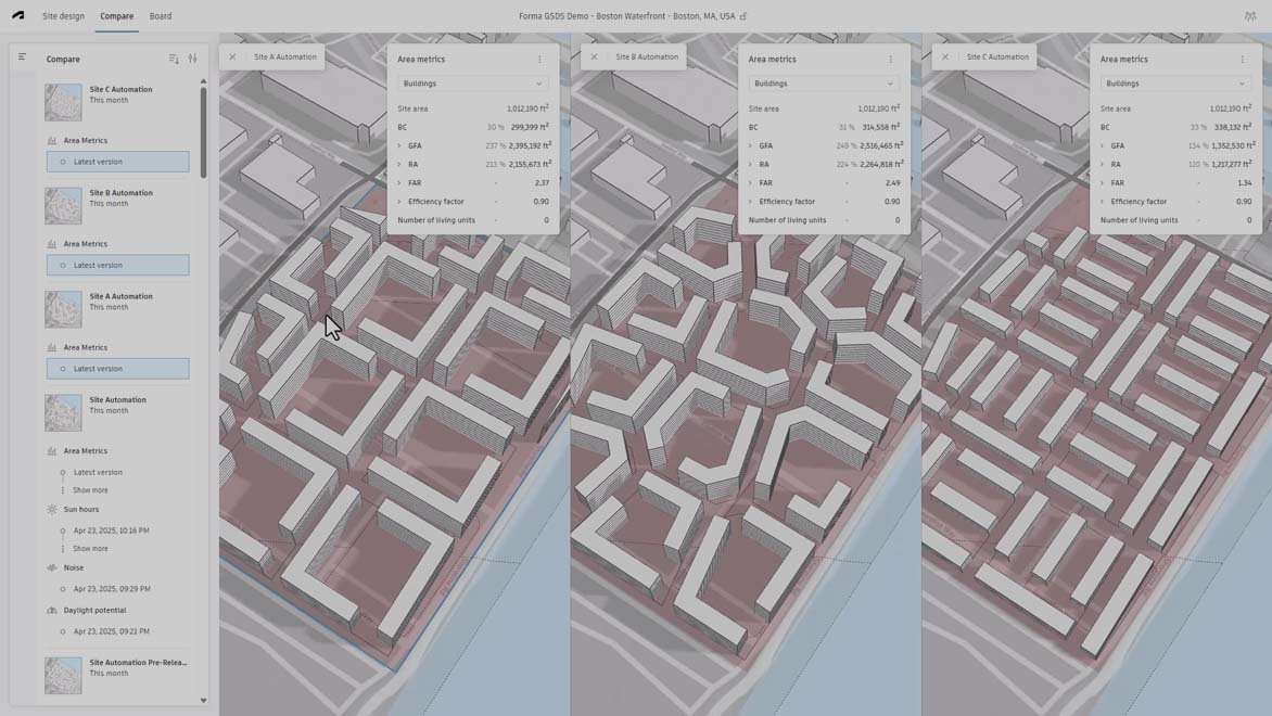 Em 8 de maio de 2023, lançamos o Forma com muitos dos recursos de IA e análises preditivas do Spacemaker para projetos arquitetônicos iniciais e planejamento urbano, combinados com ferramentas de modelagem conceitual do FormIt. Também adicionamos novos recursos, como maior disponibilidade de dados e novas análises.