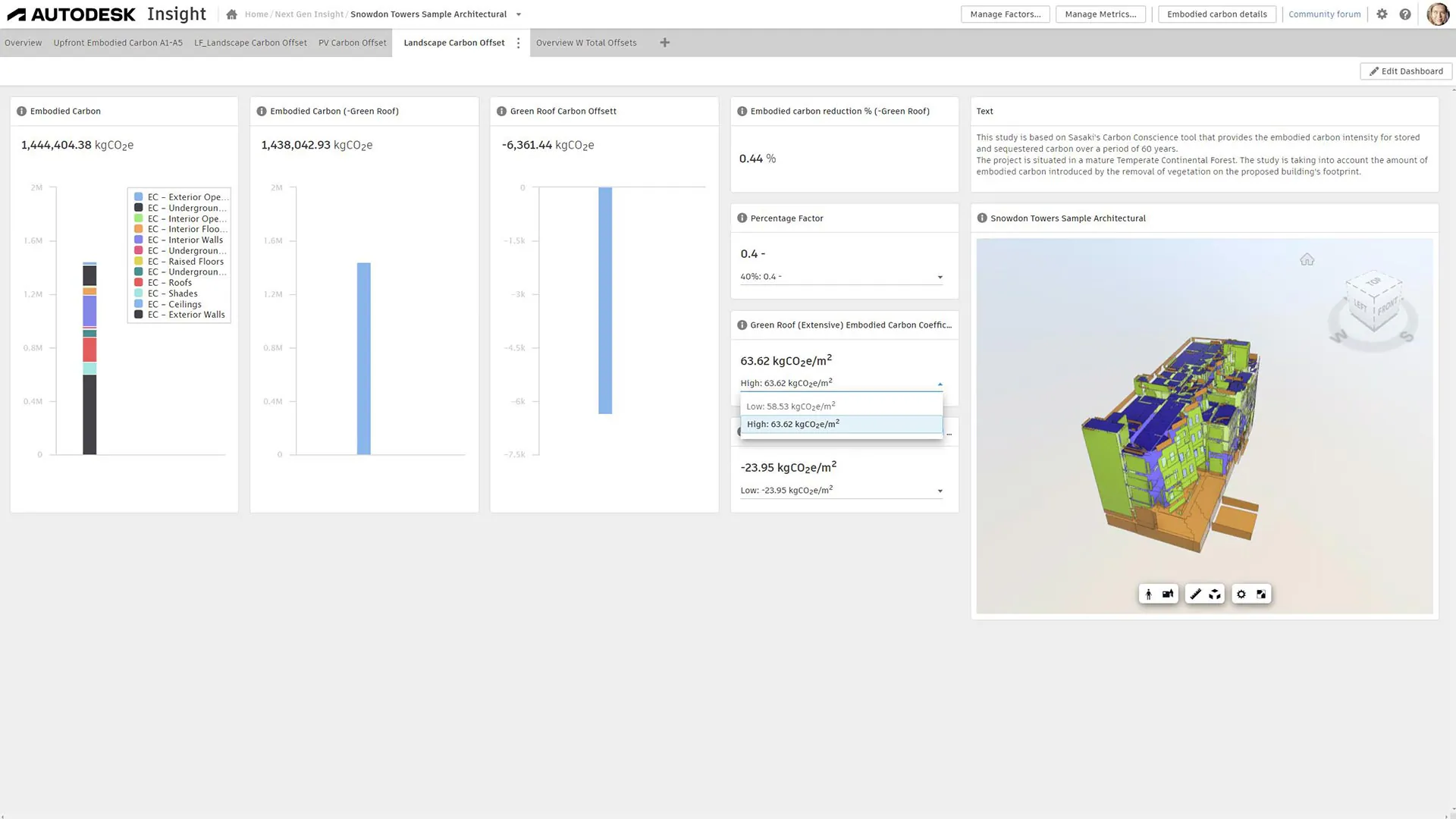 O Autodesk Insight oferece suporte a análises completas de carbono no design arquitetônico. Arquitetos e equipes de projeto usam o Insight para acompanhar o carbono incorporado e operacional por meio de painéis e métricas flexíveis e abertos. Com o Autodesk Insight, os arquitetos podem rodar simulações e cenários de carbono, visualizando os impactos de diferentes decisões de design em fatores definidos por eles – como desempenho do sistema de HVAC, forma e orientação do edifício, design da envoltória, materiais, iluminação, cargas elétricas e muito mais. Também é possível considerar dados como custos de energia e compensações com fontes renováveis para obter uma visão holística de abordagens sólidas e otimizadas para projetos de baixo carbono.